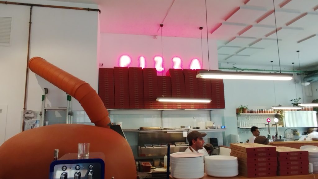 Hay que decir, que han conseguido un ambiente industrial, que se convierte en una experiencia, si tenemos en cuenta que parece que nos encontremos en un taller mecánico y que estamos comiendo Pizza.