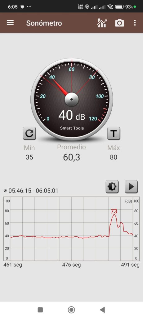Existe una fantástica app para smartphones Android llamada Smartools, que entre otras muchas herramientas útiles incorpora un sonómetro (Sound Meter Pro) que permite medir los dB y realiza una grafica que puede llegarse a exportar en formato csv. No es un sonómetro profesional calibrado de clase 1 (IEC 61672-1), pero para el experimento nos va a servir.