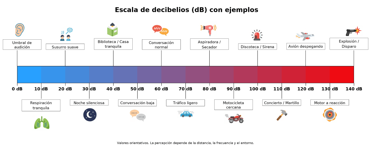 Por eso, una conversación normal ronda los 60 dB(A), una calle con tráfico puede llegar a 80 dB(A), y el umbral del dolor auditivo se sitúa en torno a los 120 dB(A).