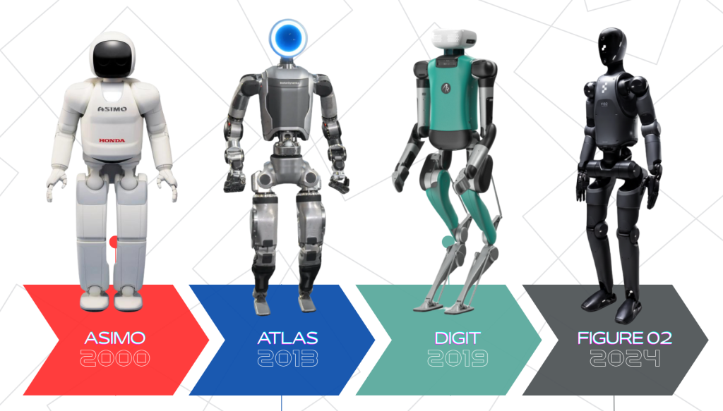 Hasta la fecha se han desarrollado varios prototipos de robots para uso experimental, industrial y militar como por ejemplo ASIMO desarrollado por HONDA en el año 2000 y posteriormente otros como Atlas de Boston Dynamics, Digit de Agility Robotics, hasta llegar a Figure 02 desarrollado por Figure AI en 2024.